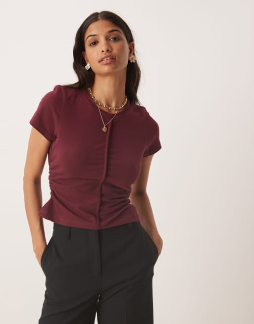 ASOS DESIGN – Bordowy krótki i obcisły T-shirt zbierany w talii ze szczotkowanej bawełny