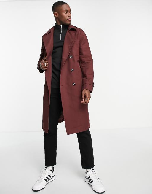 ASOS DESIGN – Bordowy przeciwdeszczowy prochowiec o wydłużonym fasonie z paskiem