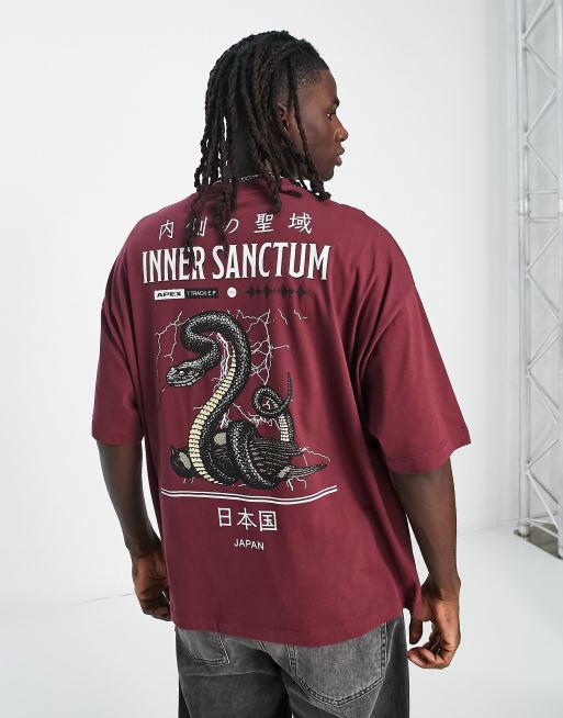 ASOS DESIGN – Bordowy T-shirt oversize z nadrukiem węża na plecach