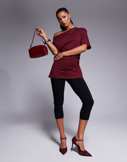 ASOS DESIGN – Bordowy zbierany top na jedno ramię z prostym dekoltem