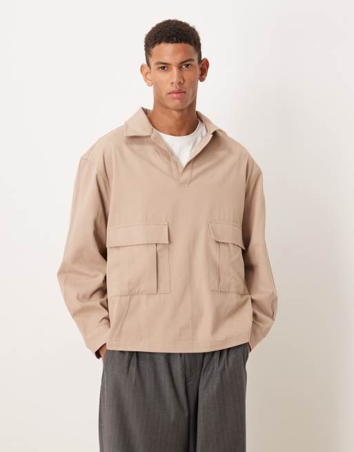 ASOS DESIGN – Brązowa bluza oversize z diagonalu z kołnierzykiem kubańskim i pojemnymi kieszeniami