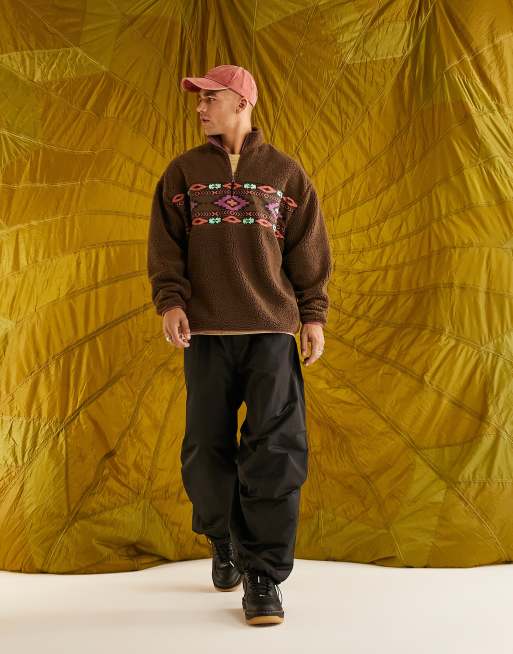 ASOS DESIGN – Brązowa bluza oversize z kożuszka z suwakiem pod szyją i azteckimi wstawkami