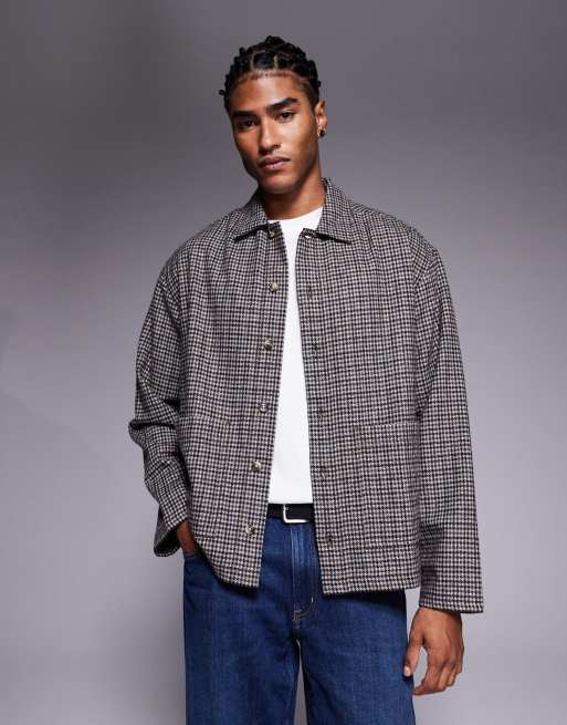 ASOS DESIGN – Brązowa koszula oversize o pudełkowym kroju z domieszką wełny w drobną krateczkę