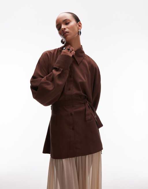ASOS DESIGN – Brązowa koszula z lyocellu z odkrytymi plecami i wcięciem w talii
