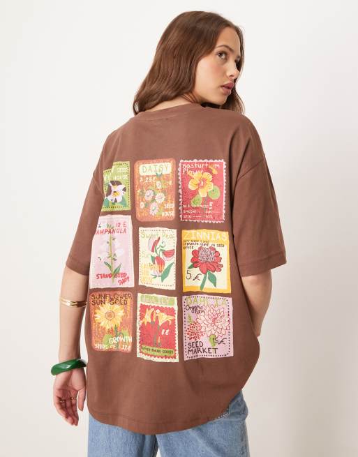 ASOS DESIGN – Brązowa koszulka oversize z grafiką opakowań z nasionami roślin