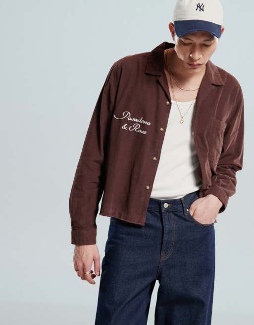 ASOS DESIGN – Brązowa krótka koszula sztruksowa z kołnierzykiem kubańskim i haftem na piersi