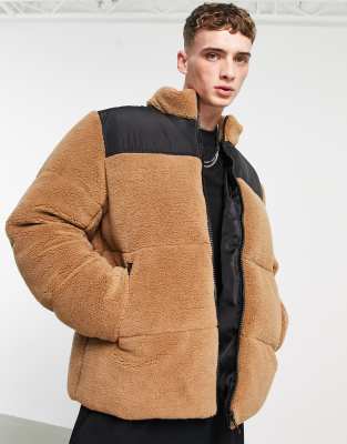 ASOS DESIGN – Brązowa kurtka puchowa z kożuszka z kontrastową wstawką