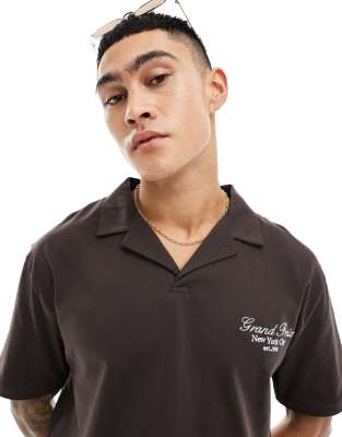ASOS DESIGN – Brązowa luźna koszulka polo z haftowanym wzorem