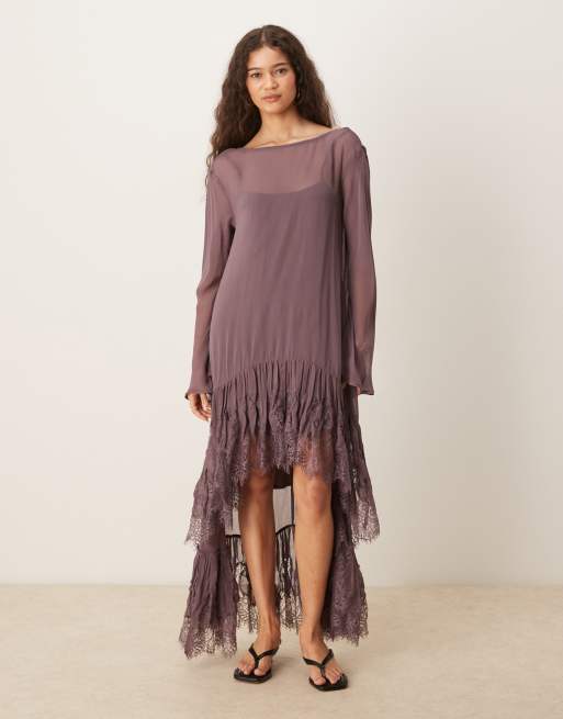 ASOS DESIGN – Brązowa sukienka maxi z długimi rękawami i asymetrycznym dołem z koronką