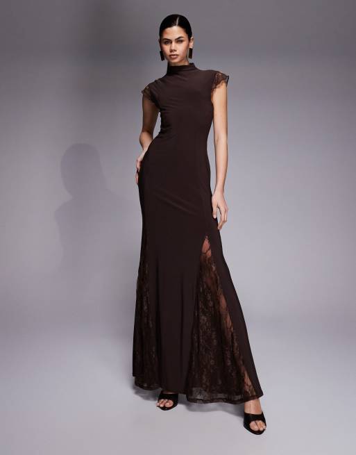 ASOS DESIGN – Brązowa sukienka maxi z golfem, krótkimi rękawkami i koronkowymi wstawkami