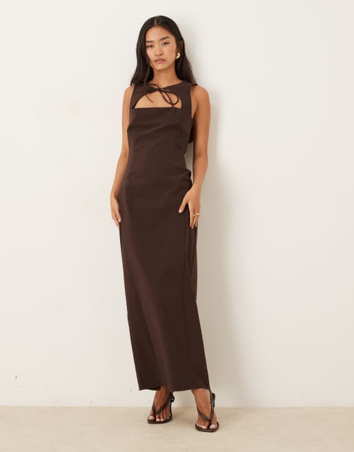 ASOS DESIGN – Brązowa sukienka maxi z wycięciem z przodu