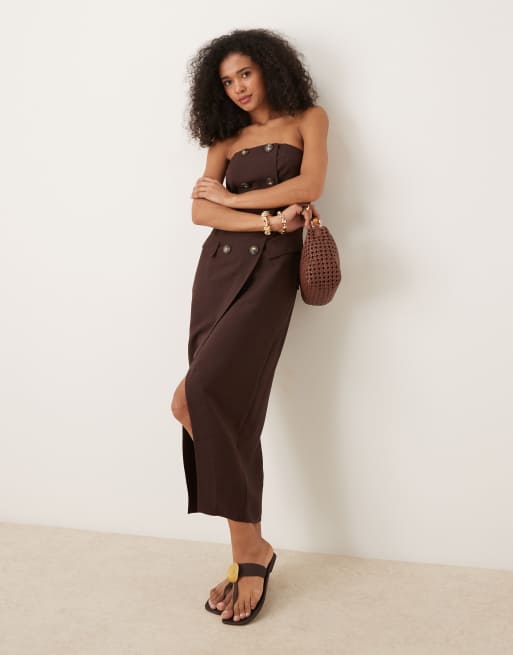 ASOS DESIGN – Brązowa sukienka ołówkowa midi z dekoltem bandeau w stylu trenczu
