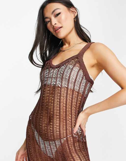 ASOS DESIGN – Brązowa sukienka plażowa maxi z materiału o ażurowym splocie drabinkowym