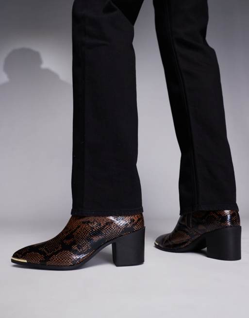ASOS DESIGN – Brązowe botki na obcasach we wzór skóry węża ze wstawką w kolorze złota