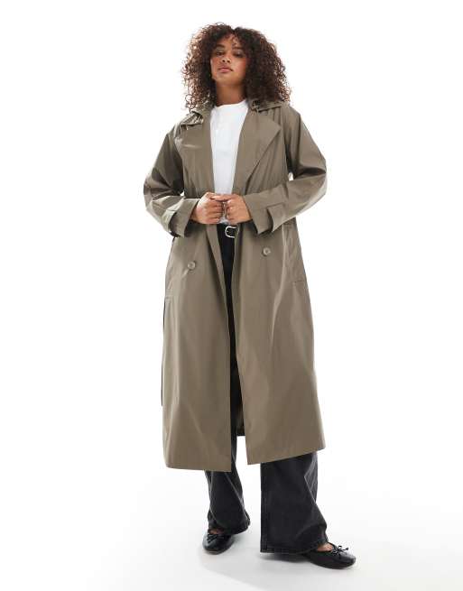 ASOS DESIGN – Brązowoszary gumowany trencz przeciwdeszczowy z kapturem i paskiem