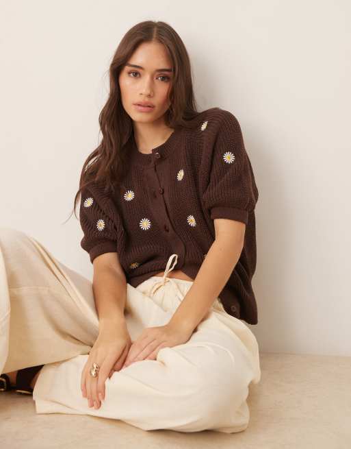 ASOS DESIGN – Brązowy dzianinowy kardigan z raglanowymi rękawami w haftowane stokrotki