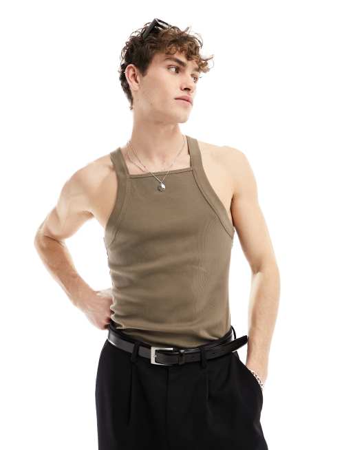 ASOS DESIGN – Brązowy prążkowany podkoszulek o kroju podkreślającym sylwetkę z dekoltem karo