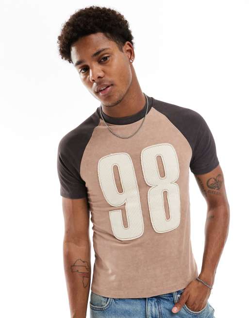 ASOS DESIGN – Brązowy prążkowany T-shirt o dopasowanym krótkim kroju z aplikacją