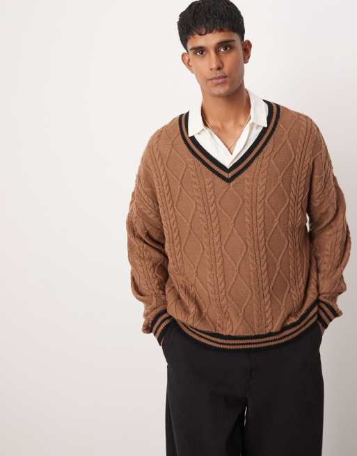 ASOS DESIGN – Brązowy sweter oversize o pudełkowym kroju i warkoczowym splocie w krykietowym stylu z czarnymi lamówkami