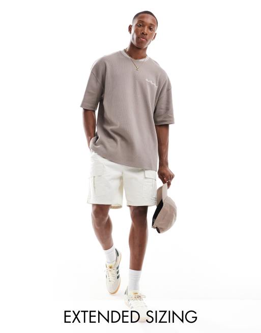 ASOS DESIGN – Brązowy T-shirt oversize o waflowej strukturze z lamówką przy szyi i napisem na piersi