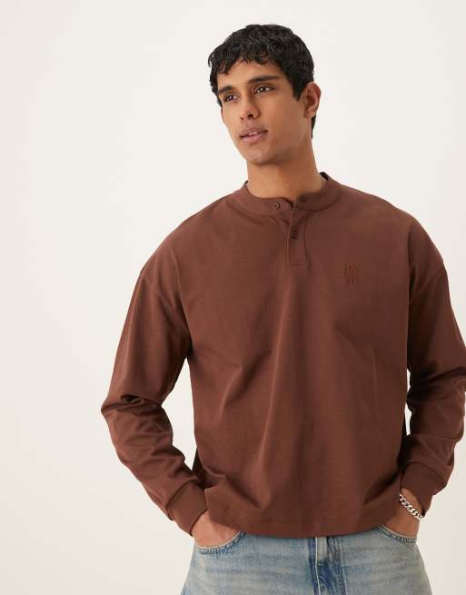ASOS DESIGN – Brązowy T-shirt z dekoltem henley o pudełkowym kroju oversize z bardzo grubego materiału