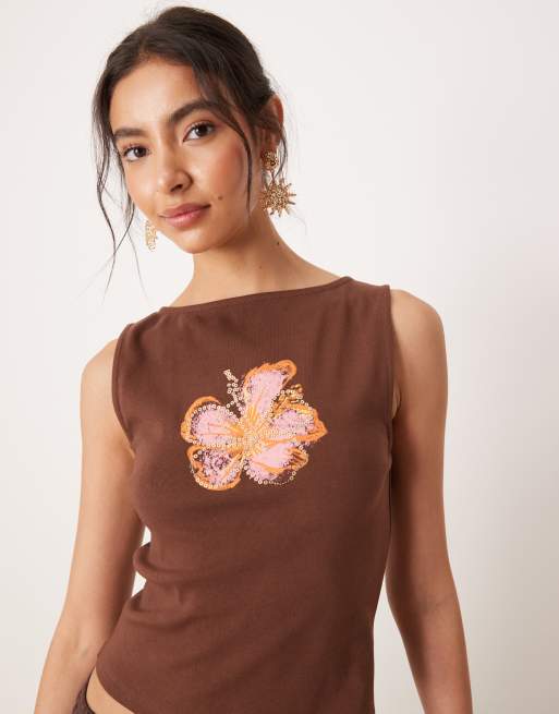 ASOS DESIGN – Brązowy top bez rękawów z prostym dekoltem i grafiką hibiskusa z cekinami