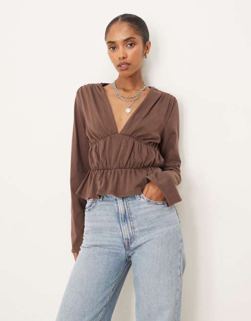 ASOS DESIGN – Brązowy top z długimi rękawami i falbanką