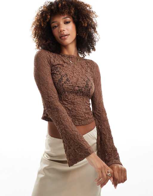 ASOS DESIGN – Brązowy top z prześwitującej siateczki z rozkloszowanymi rękawami