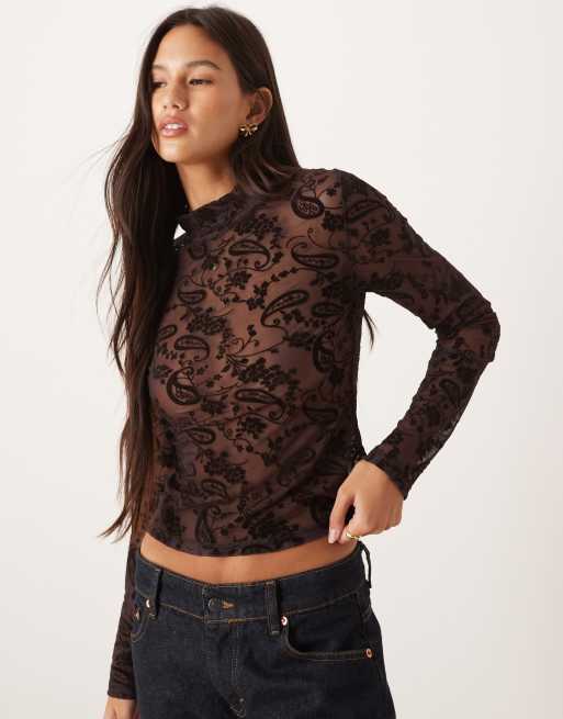 ASOS DESIGN – Brązowy top z prześwitującej siateczki z zabudowanym dekoltem we flokowany wzór paisley
