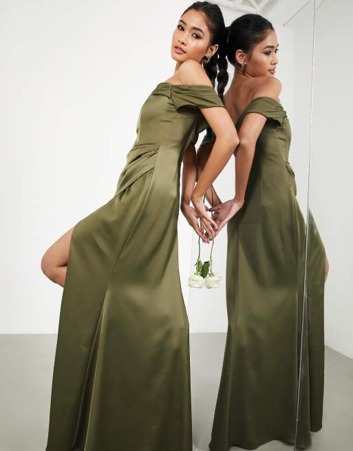 ASOS DESIGN Bridesmaid – Oliwkowa satynowa sukienka kopertowa maxi z dekoltem bardot i drapowaniem