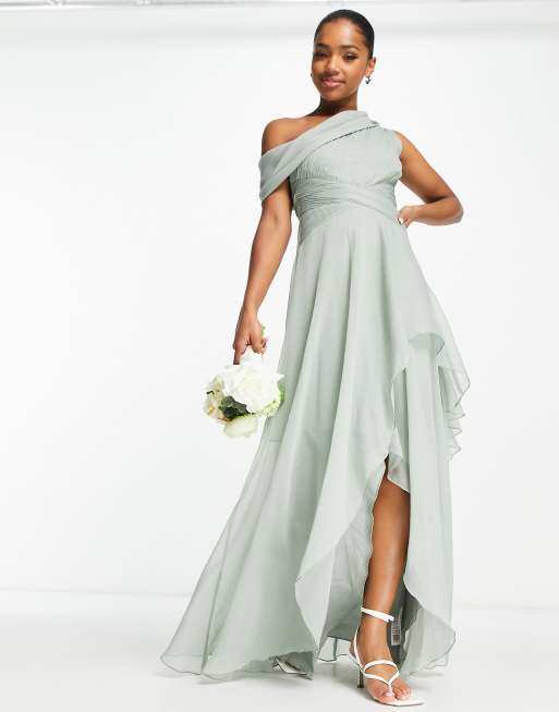 ASOS DESIGN Bridesmaid – Oliwkowa sukienka maxi z opadającym ramieniem i warstwowym kopertowym dołem