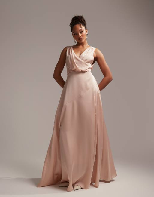 ASOS DESIGN Bridesmaid – Pudroworóżowa satynowa sukienka maxi z kopertową górą