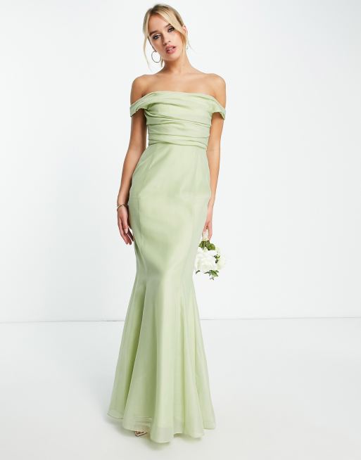 ASOS DESIGN Bridesmaid – Szałwiowa sukienka maxi z odkrytymi ramionami i gorsetową górą