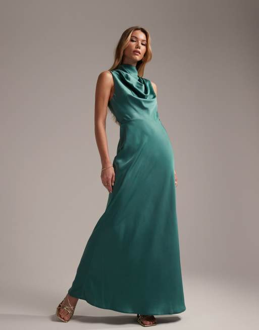 ASOS DESIGN Bridesmaid – Turkusowa satynowa sukienka maxi z wiązaniem i drapowanym zabudowanym dekoltem