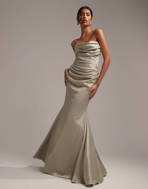 ASOS DESIGN Bridesmaids – Szałwiowozielona satynowa sukienka maxi z dekoltem bandeau