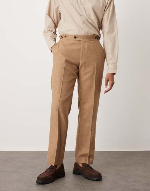 ASOS DESIGN – Camelowe eleganckie spodnie z mieszanki wełny z prostymi nogawkami i regulacją po bokach