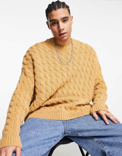 ASOS DESIGN – Camelowy gruby sweter oversize o warkoczowym splocie