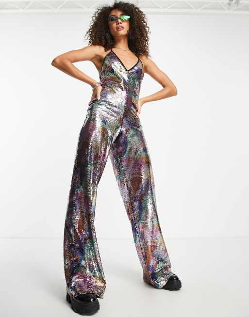 ASOS DESIGN – Cekinowy wzorzysty kombinezon z głębokim dekoltem typu halter i szerokimi nogawkami