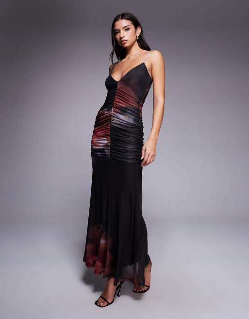 ASOS DESIGN – Ciemna sukienka maxi z marszczonej siateczki w kwiatowy wzór