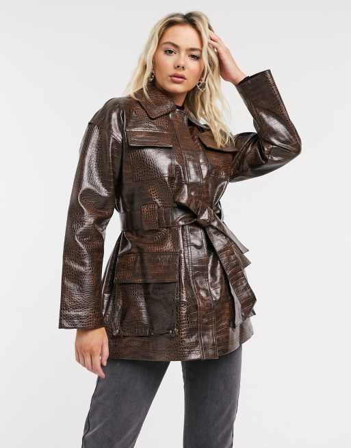 ASOS DESIGN – Ciemnobrązowa kurtka z krokodylim wzorem, paskiem i czterema kieszeniami