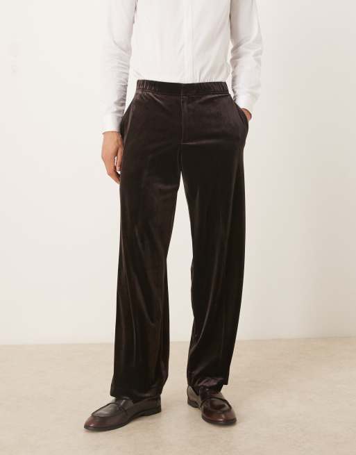 ASOS DESIGN – Ciemnobrązowe, eleganckie, aksamitne spodnie z szerokimi nogawkami i elastyczną talią