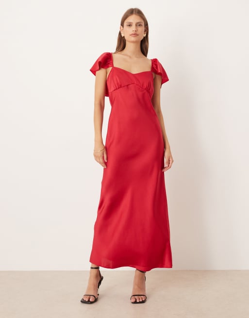 ASOS DESIGN – Ciemnoczerwona satynowa sukienka midi z rozkloszowanymi rękawami