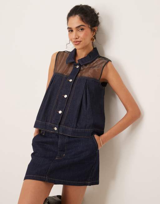 ASOS DESIGN – Ciemnoniebieska jeansowa koszulowa z szyfonową wstawką
