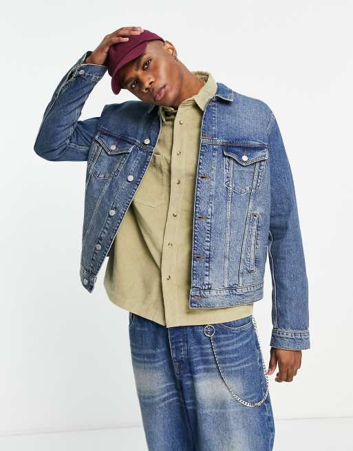 ASOS DESIGN – Ciemnoniebieska kurtka jeansowa o klasycznym kroju z przebarwieniami