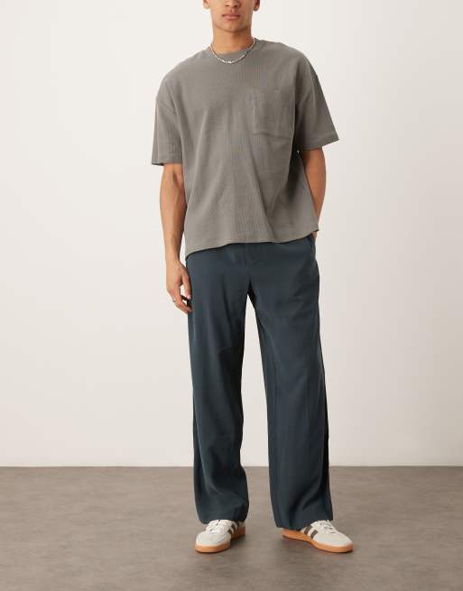 ASOS DESIGN – Ciemnoniebieskie eleganckie spodnie z szerokimi nogawkami i elastyczną wstawką w talii i lampasami