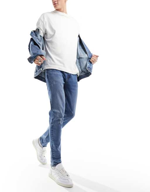 ASOS DESIGN – Ciemnoniebieskie jeansy o obcisłym kroju z przetarciami na kolanach