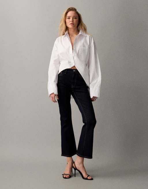 ASOS DESIGN – Ciemnoniebieskie jeansy z rozszerzanymi nogawkami, o krótkim fasonie