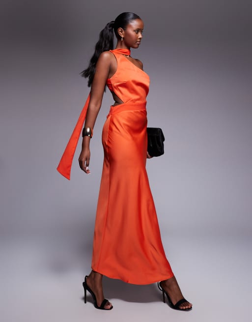 ASOS DESIGN – Ciemnopomarańczowa satynowa sukienka midi na jedno ramię z szalem