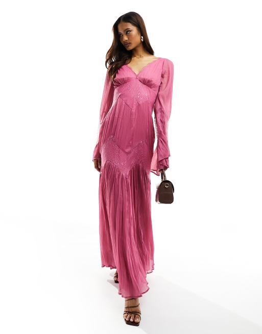 ASOS DESIGN – Ciemnoróżowa gnieciona sukienka maxi z długimi rękawami i wstawkami z koronki