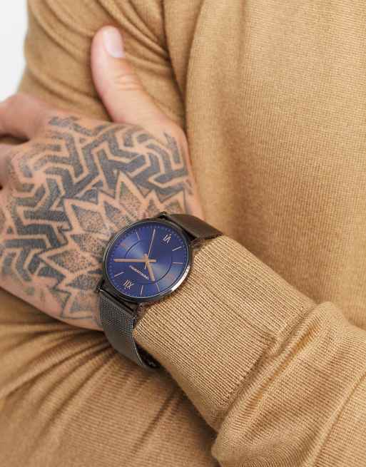 ASOS DESIGN – Ciemnoszary zegarek ze stali nierdzewnej na siateczkowej bransolecie z niebieską tarczą